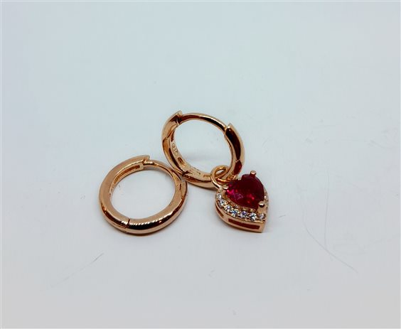Orecchini argento 925 in bagno oro rosa, cerchietto a scattino diametro 1 cm con un pendente asimmetrico cuore pietre rosse e bianche.