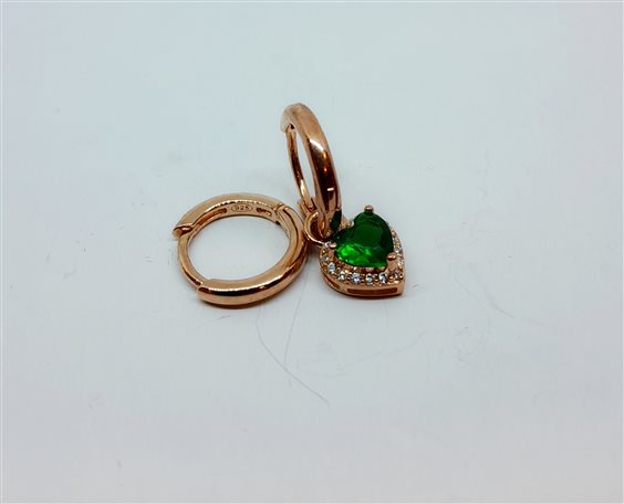 Orecchini argento 925 in bagno oro rosa, cerchietto a scattino diametro 1 cm con un pendente asimmetrico cuore pietre verdi e bianche.