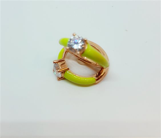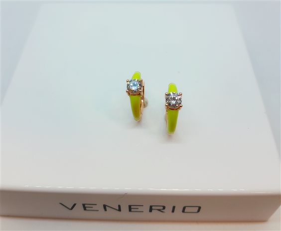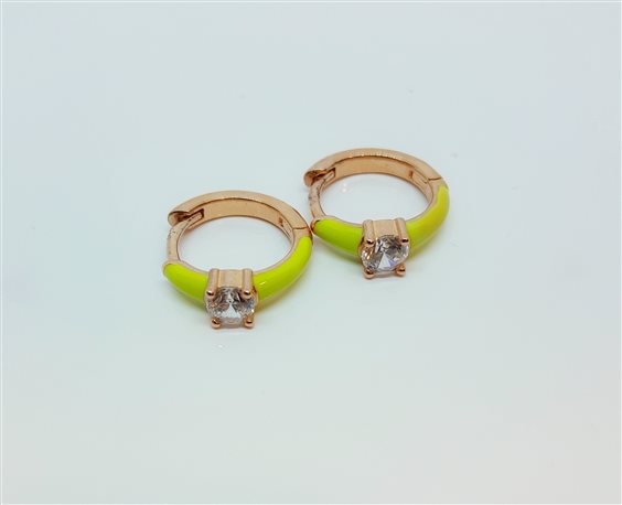 Orecchino a cerchio chiusura a scattino, argento 925 in bagno oro rosa con smalto giallo acido e zirconi.