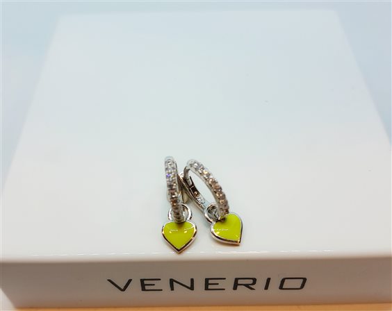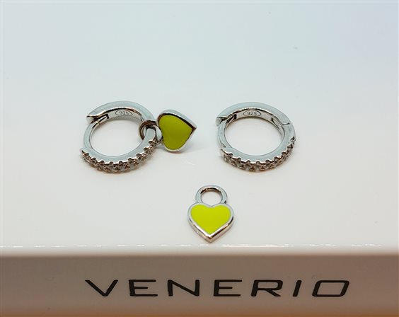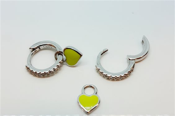 Orecchino cerchio chiusura scattino, argento 925 rodiato con zirconi pendente cuoricino con smalto giallo fluo estraibile.