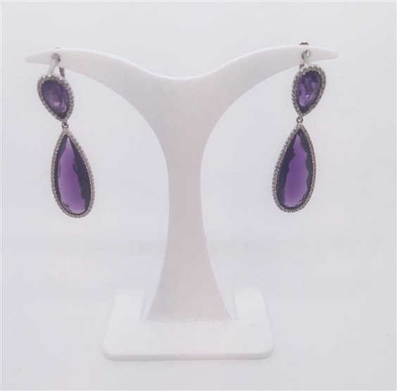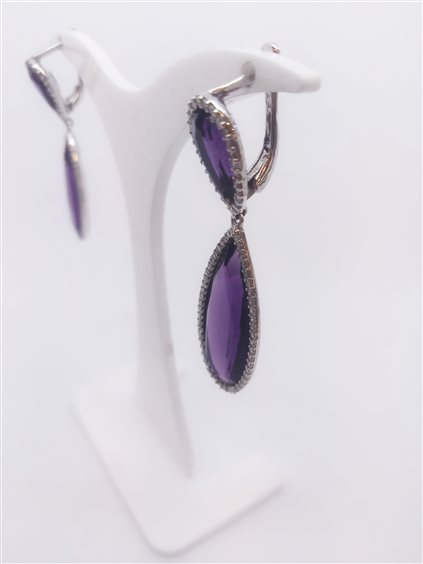 VENERIO ARGENTO orecchini pendenti in argento 925 rodiato con chiusura a scattino composti da due gocce in cristallo viola con contorno di cristalli bianchi incassati a quattro punte. Anallergico, nichel free.