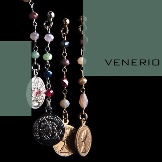 VENERIO ARGENTO Orecchini pendenti della linea MONETE in argento 925 placcato oro giallo con chiusura a farfallina, pendente con quarzi multicolor sui toni blu, rosa e marrone incatenati e terminanti con un ciondolo a monetina facsimile L500. Lunghezza 5 cm