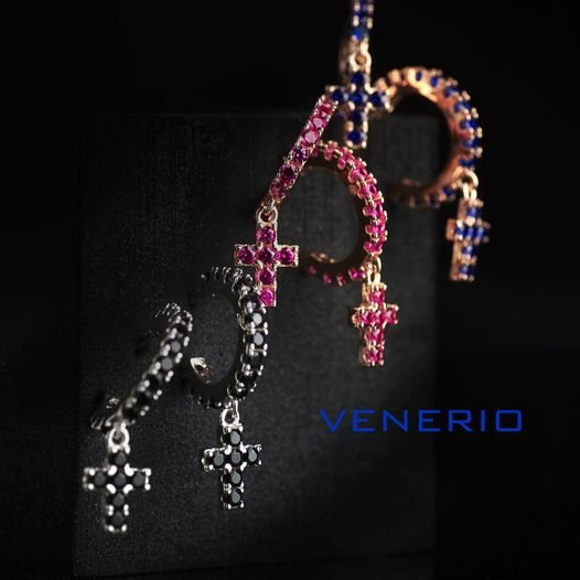 VENERIO ARGENTO Orecchini a cerchio aperto con chiusura a farfallina in argento 925 placcato oro rosé con pietre blu montate a griffes e pendente a croce. Diametro cerchio 1,5 cm, misura croce 0,8 cm